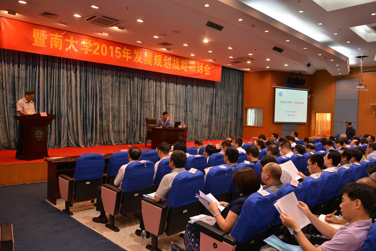 10月10日-11日,暨南大学2015年发展规划战略研讨会在曾宪梓科学馆国际会议厅召开。会议以“深化机制体制改革,扎实推进高水平大学建设”为主题,围绕《高水平大学建设与综合改革方案(2015-2017)》、博士后工作改革办法、高水平大学建设过程中领导干部的责任与担当三个议题展开。领导胡军、蒋述卓、叶勤、刘洁生、林如鹏、宋献中、饶敏、叶文才,校长助理王志伟,学院、部处直属单位领导和学科组团代表出席了研讨会。