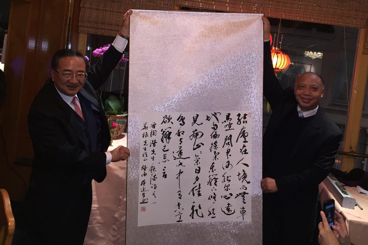 10月16日晚,代表团一行与卢比荷校友会济济一堂,共同庆贺109周年华诞,为来年的110年华诞庆典预热。蒋述卓在致辞中介绍了在“十二五”建设期间所取得的成就和“十三五”期间着力进行高水平大学建设的宏伟目标,希望欧洲地区的校友能在110华诞之际回到母校,共襄盛典。他高度评价了校董和校友会在凝聚暨南人心、提升在欧洲的影响力方面所起的积极作用。蒋述卓向杨华根赠送了自己亲自题写的书法作品《饮酒》,以感谢他为和卢比荷校友会所做出的巨大贡献。