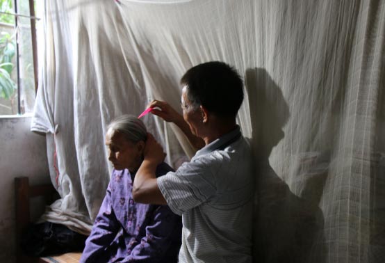赖锡芬坐在床上帮母亲梳头。尽管赖锡芬自己也年过半百,但他仍坚持每天帮母亲做早餐、洗衣服、梳头等,这些都是赖锡芬每天必须要做的事。