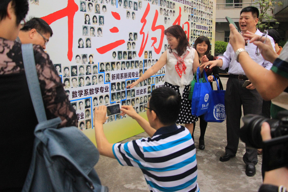 9时许,天空开始下起了毛毛雨,校友楼前的热闹却有增无减。生物系的来了,数学系的也来了,护理专业的快到齐了……他们久别重逢,来一个拥抱,再聊聊各自的发展状况,接着抱团去签个到,再到“相约三十年”的展板前合个影,一张又一张,怎么都停不下来.