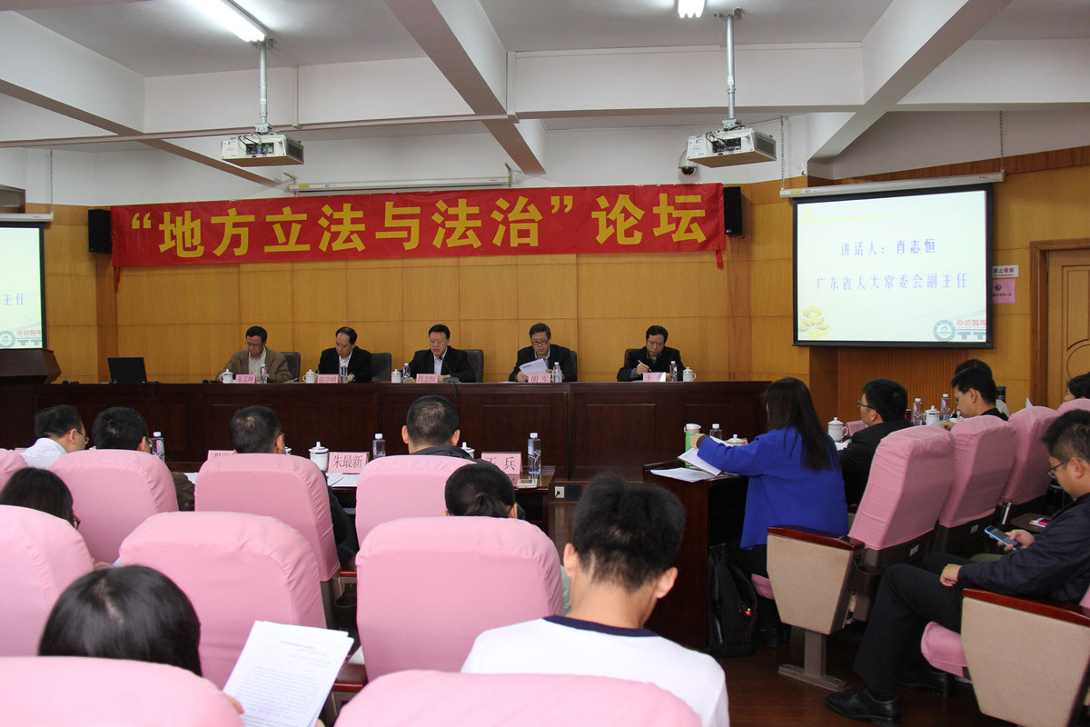 广东省人大常委会副主任肖志恒、校长胡军分别致辞,广东省依法治省领导小组办公室常务副主任陈岸明和广东省人大常委会法制工作委员会主任王波主持主题讨论。