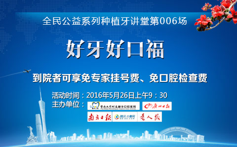 2016年5月26日上午9:30,全民公益系列种植牙讲堂第006场将邀请穗华口腔医院种植科主任冯智强和穗华口腔医院资深种植科专家赵清桐为广大缺牙者解疑释惑,让缺牙者更深入地了解种植牙,拥有好牙好口福。