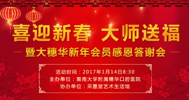 时光荏苒,斗转星移,又迎来了新的一年。在过去的一年里,穗华口腔医院以领先的国际口腔医疗技术和强烈的社会责任感,不仅为广大市民解决口腔问题,还先后为近万名口腔患者义诊,免费治疗,赢得了广大市民的信任与认可。喜迎新春,举国同庆,为了答谢广大市民,2017年1月14日穗华口腔医院将携手书法名家举行新年会员感恩答谢会,新春联袂献技,为市民们送上新年祝福!