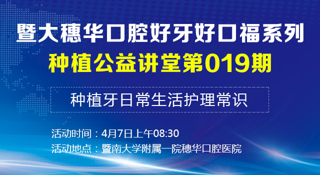 很多缺牙患者找到穗华口腔医院的种植专家成功种植了牙齿,而种植牙后需要注意什么?种植牙后如何保养才能用的更长久?很多种植牙患者种牙之后可能都不会去注意如何做术后护理,导致种牙之后出现各种问题。为了提高种植牙术后的使用质量,延长种植牙的使用寿命,穗华口腔医院将开展好牙好口福系列之第019期种植公益讲堂,邀请了穗华口腔资深种植专家冯智强博士为大家宣讲种植牙术后护理常识,到时并会与观众进行互动问答,为种植牙患者详细讲解种植牙后要注意的相关问题。
