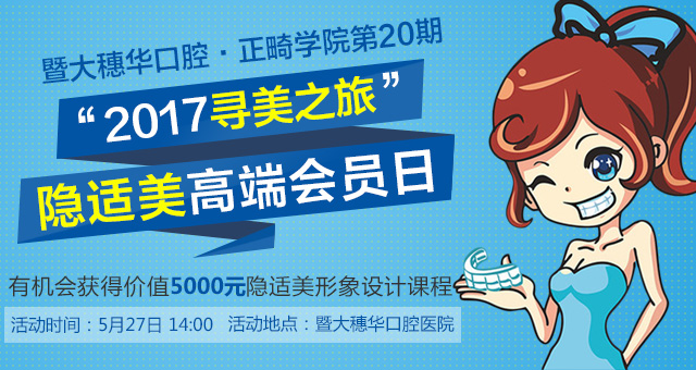 2017年5月27日,穗华口腔医院将举办穗华口腔医院·正畸学院第20期“2017寻美之旅”隐适美高端会员日 ,为广大正畸患者量身定制完美的矫正方案,看不见的牙套,看得到的改变,让你展现美丽,重拾自信笑容。