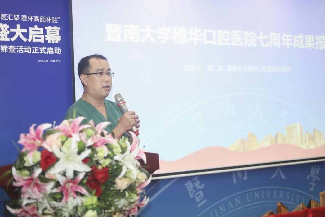 会议上, 穗华口腔医院总院长赖仁发教授汇报了这7年来取得的成果,他表示,作为中国“多点执业”模式的医院,穗华口腔医院的发展与进步,一直备受外界关注。自2015年6月成立至今,总服务人次超120 万,患者满意度达99.56%,在天河、荔湾、海珠、白云、黄埔、越秀等区域,设立分院区,形成“一城九院”的院区覆盖版图,九家分院总面积15848㎡,牙椅数212张,总覆盖服务人群达613万人。